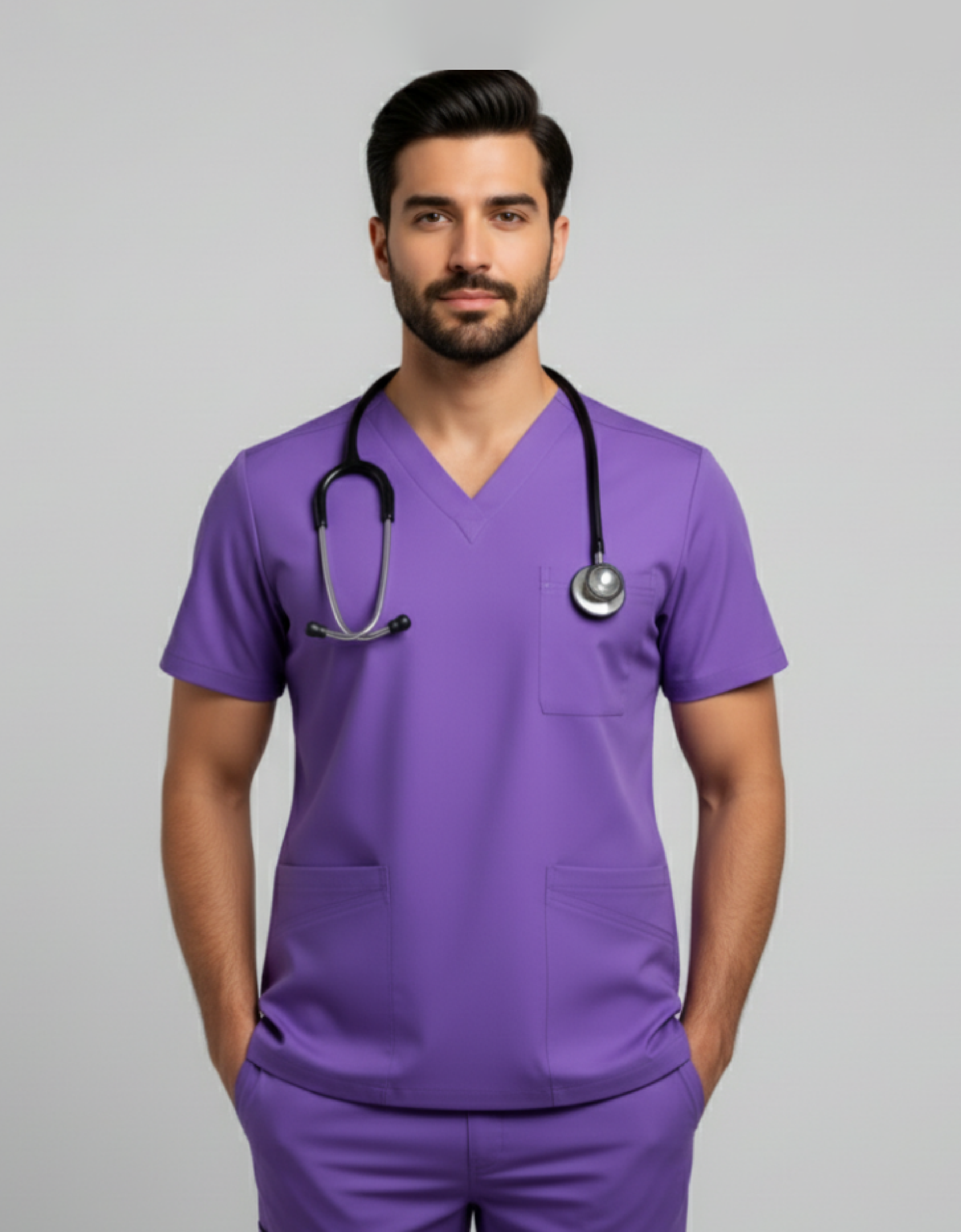 Experience calm comfort and reliable style in this soothing cotton Purple V-neck scrub. Made from soft, breathable cotton, it keeps you cool and comfortable during long shifts while maintaining a fresh, professional appearance. The classic V-neck design ensures you feel both polished and at ease throughout your day.