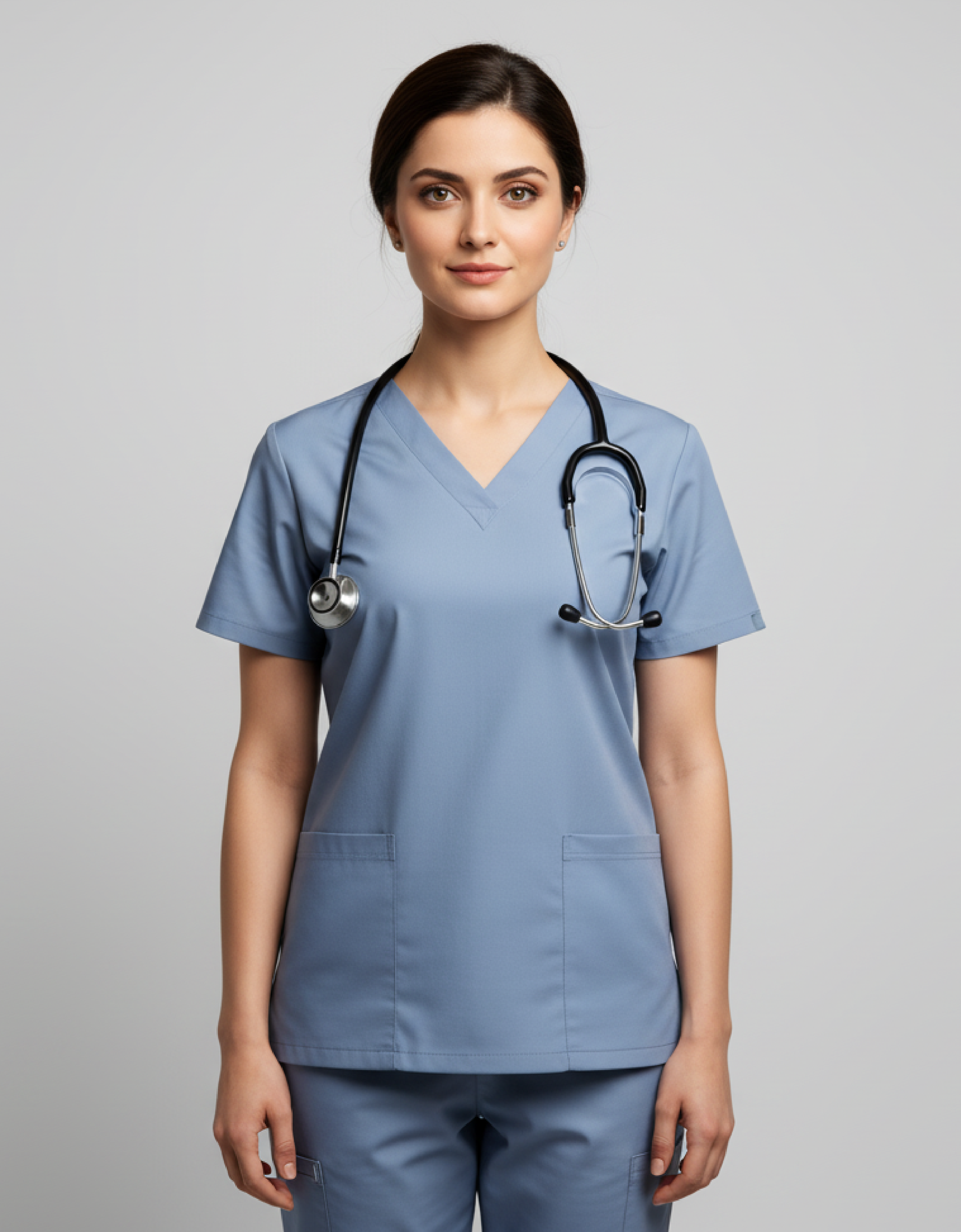 Experience calm comfort and reliable style in this soothing cotton Light Blue V-neck scrub. Made from soft, breathable cotton, it keeps you cool and comfortable during long shifts while maintaining a fresh, professional appearance. The classic V-neck design ensures you feel both polished and at ease throughout your day.