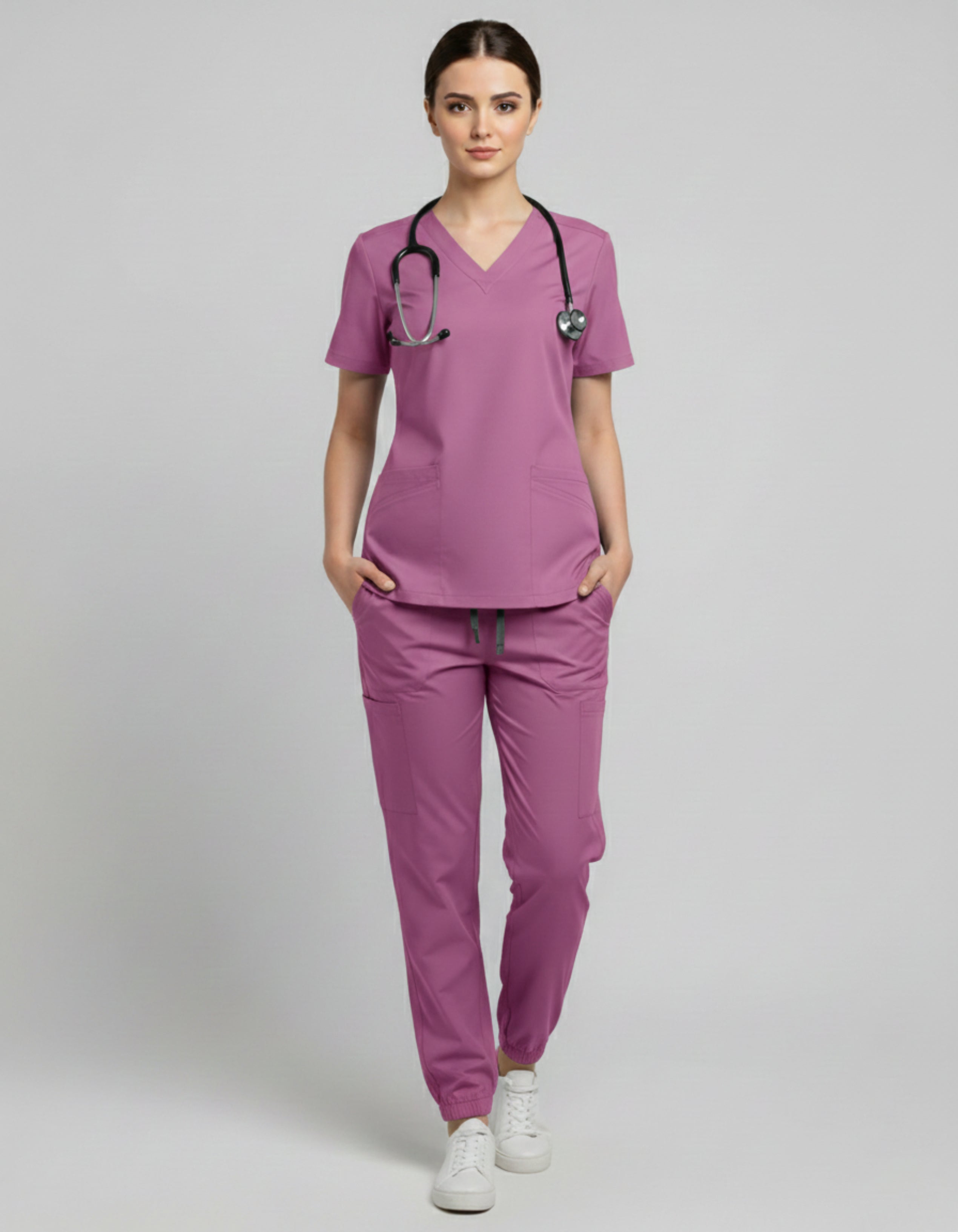 Stay cool and confident in this cotton pink V-neck scrub set. It’s made to keep you comfy and stylish all day long. The breathable cotton fabric helps you stay fresh, even during long shifts. Plus, the gentle V-neck adds a clean, classic touch to your everyday look.